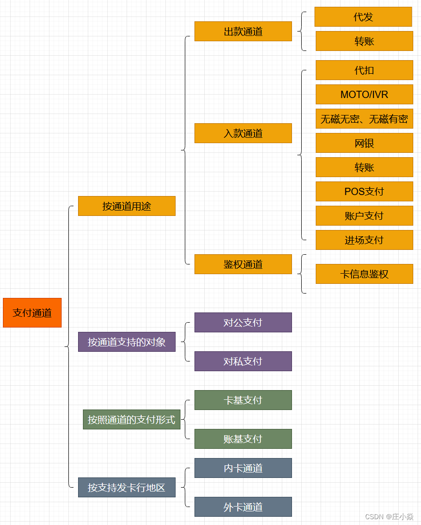 按照用途、支持对象、支持形式、支持发卡行地区,可以将支付通道进行如图下所示的分类。下面来分别来介绍各种分类。