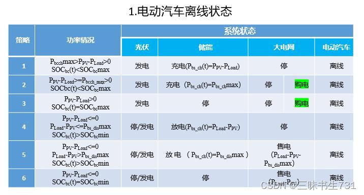 所谓的策略就是根据功率情况,制定电动汽车电源等的行为,如上图所示,状态变量名就不一一解释了,就是常用的符号,应该能懂。
