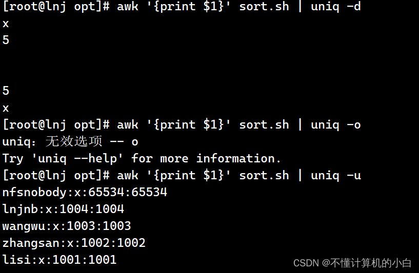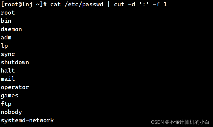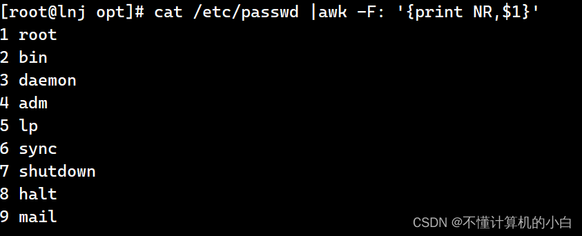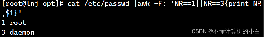 cat /etc/passwd |awk -F: 'NR==1||NR==3{print NR,$1}'表示输出第一行和第三行不连续