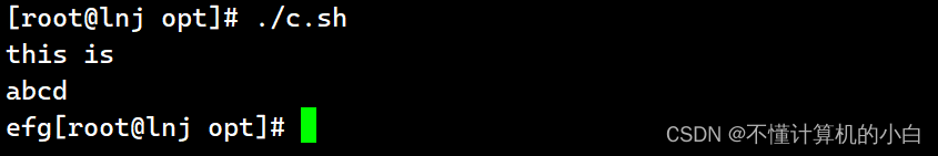 2.命令替换。等同于cmd,shell扫描一遍命令行,发现了( c m d ) 结 构 , 便 将 (cmd)结构,便将(cmd)结构,便将(cmd)中的cmd执行一次,得到其标准输出,再将此输出放到原来命令。有些shell不支持,如tcsh。
