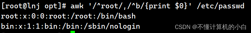 awk '/^root/,/^b/{print $0}' /etc/passwd这里表示以root开头b结尾的行