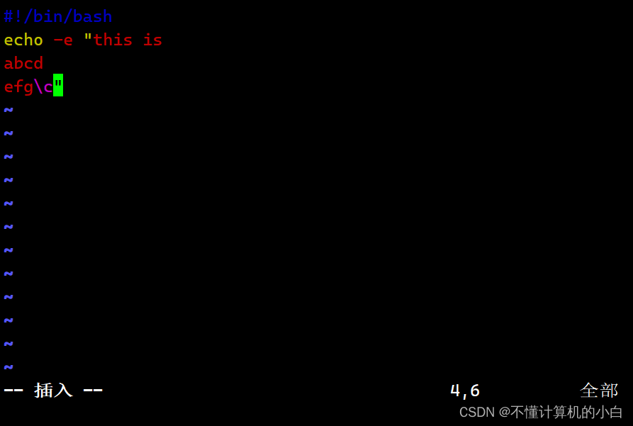 \c:不换行输出,在"\c"后面不存在字符的情况下,作用相当于echo -n;但是当"\c"后面仍然存在字符时,"\c"后面的字符将不会被输出。