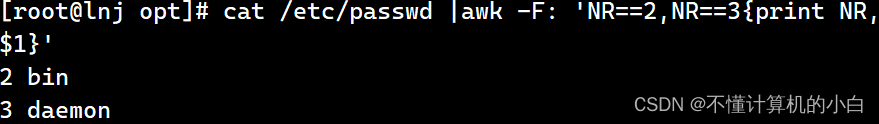 cat /etc/passwd |awk -F: 'NR==2,NR==3{print NR,$1}'表示输出二到三行