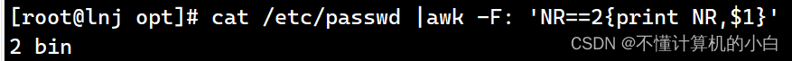 cat /etc/passwd |awk -F: 'NR==2{print NR,$1}'这里给nr定义,表示第二行