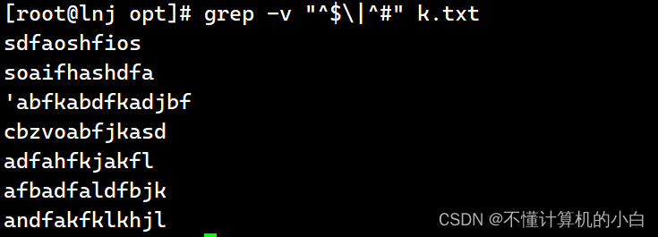 -v:反向选择,亦即显示出没有'搜寻字符串′内容的那一行! (反向查找,输出与查找条件不相符的行)--color=auto : 可以将找到的关键词部分加上颜色的显示喔!