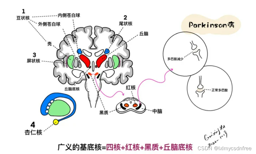 冠状位:基底核与丘脑、脑室的位置关系 广义的基底核 = 四核 + 红核 + 黑质 + 丘脑底核