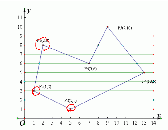 所以对于 P2,P4 这种左顶点和有顶点的情况,需要把相同的交点只取一次值。常采用的方法是修改以顶点为终点的那条边的区间,将顶点排除在区间之外,也就是删除这条边的终点,这样在计算交点时,就可以少计算一个交点。即只要将该边的ymax修改为ymax – 1就可以了。