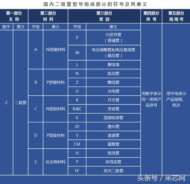 (1)按照国产半导体器件型号命名方法:二极管的型号命名由五个部分组成:主称、材料与极性、类别、序号和规格号(同一类产品的档次)。
