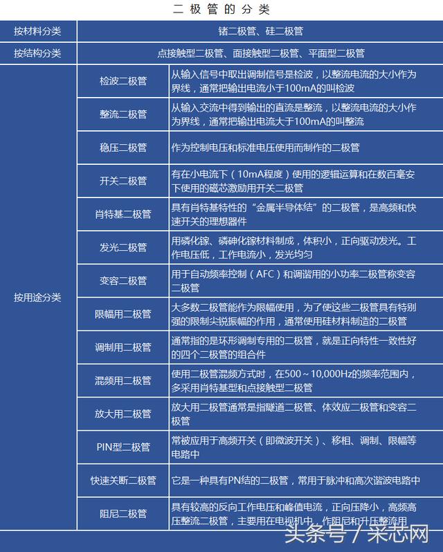 根据二极管的不同用途,可分为检波二极管、整流二极管、稳压二极管、开关二极管、肖特基二极管、发光二极管等。