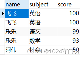 可见,该执行语句只是将查询结果完全一致的数据排除了, 姓名相同,科目不同的“乐乐”的数据则没有排除。