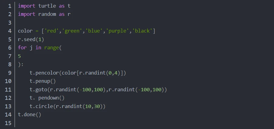 (1)使用turtle库和random库,在屏幕上绘制5个彩色的圆;