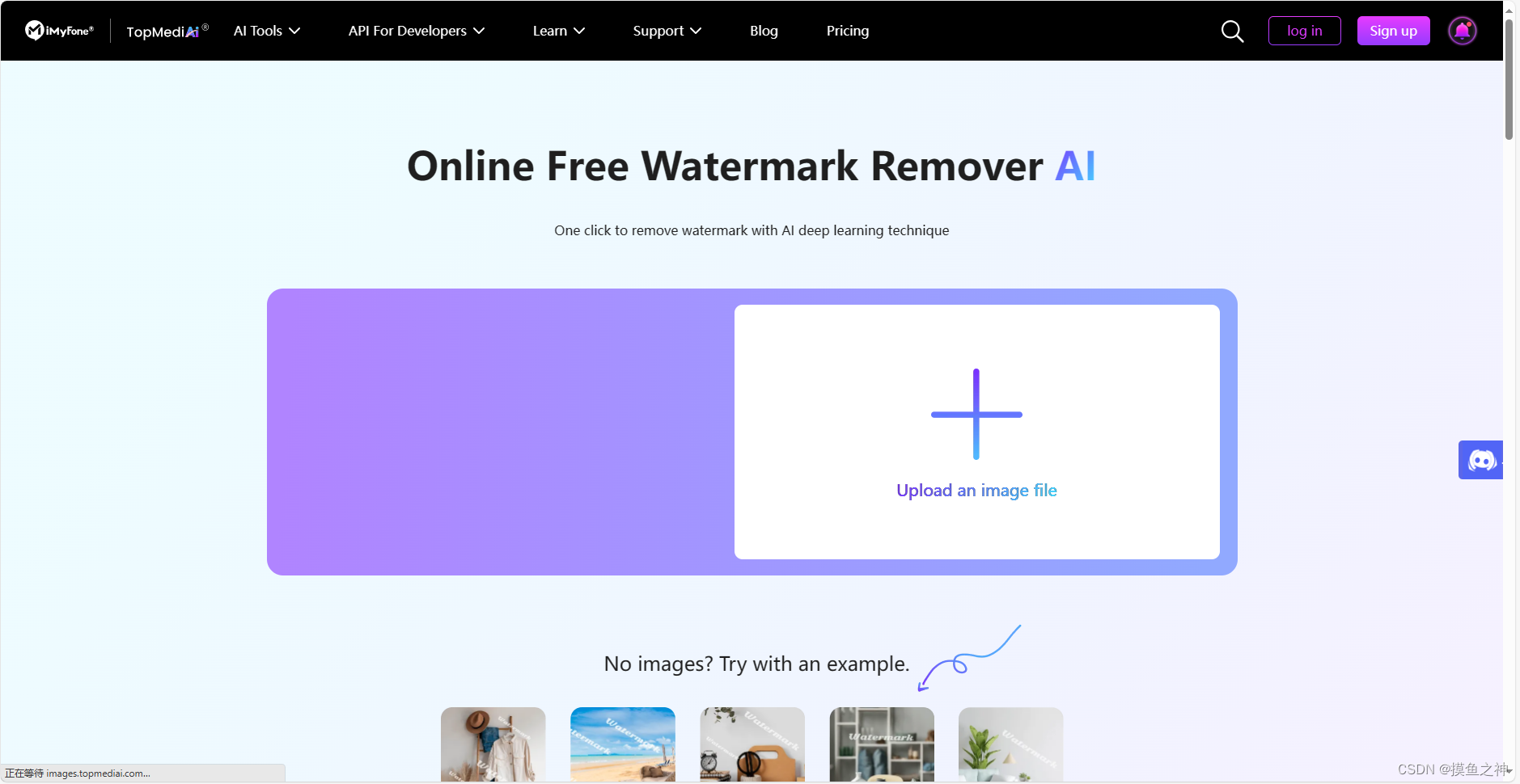 在官网主页面上方的AI Tools扩展栏找到Watermark Remover,点击即可进入去水印功能页面,使用方法和上面的两个网站类似就不赘述了。