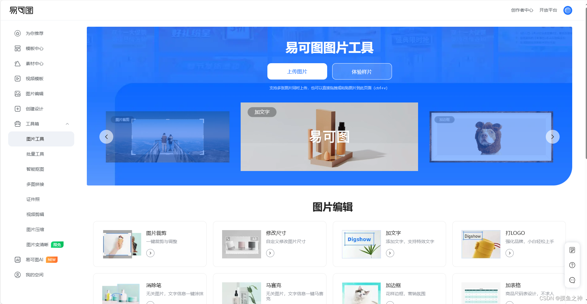 ①打开易可图网站,点击图片工具->消除笔,上传一张图片