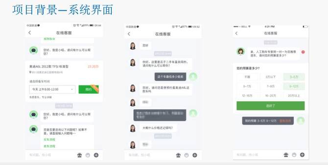 这是截了几个图,我们看第一个图,我们上边就有一个车,下边有个预约,用户事实上是可以直接在聊天界面里面去点预约了。这个就是我说的跟一般的客服不一样的,它可以做一些叫做导购或者叫营销也好,直接通过这样一个途径,因为瓜子的获客成本很高,每个访问瓜子的用户我们都希望及时跟他沟通,这个图有助于大家理解。