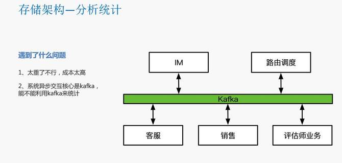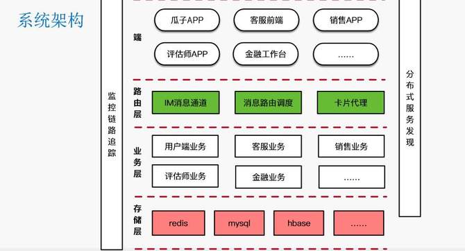 第二是一个路由层,我们要打通这些业务。要让这些业务在这个系统里边及时的传递,所谓传递刚才前面有个图案,比如说你想约车了,那客服就给你或者电销就给你发一个约车的卡片,你就可以直接选时间约,这是传递业务。再往下边是一些业务层,那就是原来瓜子有很多有什么业务就涉及什么业务,最底下是一个存储。这次后边主要讲的就是站在存储层的角度来看整个系统,重点会讲存储层怎么对路由层进行支持。
