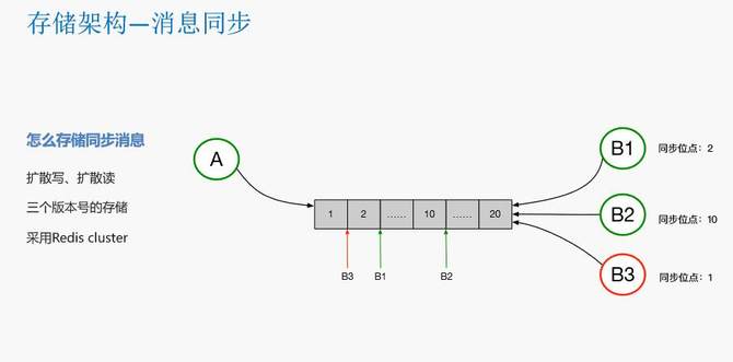 那比如说这个图上的B1B2B3,当前消息的我们另外存在一个最大消息的号。第三个号你所有的里边搜的消息最靠前的一块就说比较像B2这样通过这三个位置的组合,我们可以确定你收取消息的位置或者一个策略,这是这个模型,我们存储采用什么?我们采用了Redis cluster,我们用了SortedSet结构。