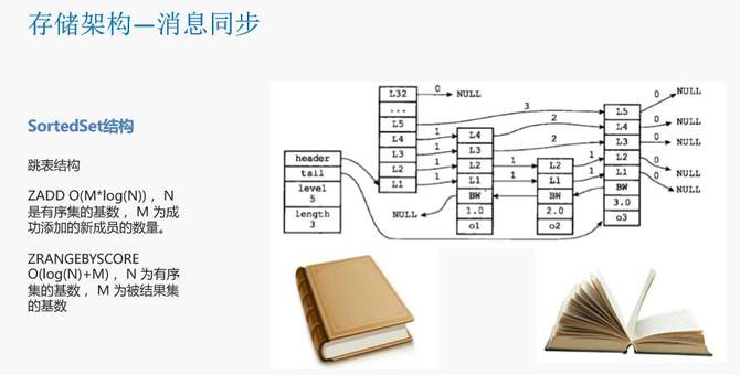 我专门把它提出来了,因为我们其实在这还踩过一个坑,我要存这个消息了,怎么都得知道这个结构的效率,我们查了一下SortedSet效率还可以,就说它是一个ln这样子一个效率,所以说在同步库,如果我们每个用户只存一部分消息,它的性能是非常高的。这个结构本质上是个跳表,跳表结构其实很复杂,我想在这会上讲清楚很难,最后放了两个图,就是一本书。
