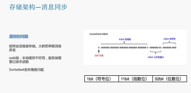 下面分享一下这块我们遇到了一个什么问题!我们SortedSet存储,存消息,而我们存消息为了全局一致性,用了一个思路。这个算法我们消息是一个长整型,就是上班卡,我先讲的是没关系,先讲下面精度丢失的问题,我们的消息是一个长整型。这个场景下总共是64位,所以说snowflake这个算法,它的前面第一位不用,它其实表示正整数它是有意义的。用41表示一个时间区间,这里面产生一些ID代表了大概有六七十年或者三四十年,反正是肯定是够用了。