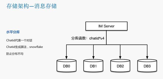 接下来我们讲一下存储这块,我们存储消息要落库了,我们怎么存消息?我们刚才提到了,是按照每个会话你看到的每个人跟你聊天的一个维度来存储。我们也是采用了分库的策略,分库比较简单。这举个例子,事实上这个库不止这么多个,我们把一个他的消息绘画的ID除以四,取它的模来确定它到底放到哪个库里边,刚才提到了我们很多ID是用snowflake算法来生成的,我们有个方法来防止它的生存不均,看一下。这是一个我们防止它的ID分布不均的一个方案。我们看到最后有一个12位的序列号,如果你不加任何干预,他每次都从零开始,事实上当你并发比较小的时候,你会发现它后边都是零,就最后几位都是你这样子,如果都是零,你用是你用固定的取模的算法,他就绝对是不平均了。