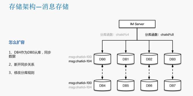 说一下怎么扩容。刚才之前提到的最开始业务量很少,但是前几天瓜子一天已经卖出1万辆的车了,所以说这个量现在我们是逐步的会在起来,当成交1万辆,用户量是非常大的。我们怎么扩容,这就是扩容的基本方法。我们最初有db0123这样几个库,我们看一下左边有就是这个图的左边,一个msg:chatid=100和msg:chatid=104,以前chatid除以四的时候,100和104这两个数据,这两个数据它都会并重db0这个库。我们分库的时候怎么做?第一步我们把db0123这样的库同时进项,我就要主从同步,反正在搞db4567,db0和db4数据一样的db1和db5数据也一样,相对应的一样。我们把分库策略改成除以八求余,之后的结果就出现什么?我们就发现按照新的分库策略,chatid104还在db0里面,chatid100它由于除了之后他就到db4了,这样子我们就相当于是从四个库直接就变成了八个库,之后的过程就是分库规则上线之后,我们再由DBA把不属于库的其他数据给删掉,这个库的扩容就搞定了,所以说业务可以接着跑,但是这样子是不是就解决问题了?其实没有简单,远远没有,因为你像我们的数据库前面的数据库是MySQL,为了安全,他有一重两重可能还有扩库,简直这个数据库越来越多,它运维和DBA他就不干了,说你这库越来越多,我怎么维护,这个受不了了。