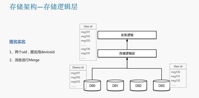 这里跟大家分享一下,瓜子它APP的地位还不够高,我第一次用的时候一点它要登陆,因此我们要做一些匿名的策略,我们希望匿名的状态下你已经能建立沟通了,如果你觉得可以我们再接着聊,卖车也好,买车也好,所以说匿名就对我们这个业务带来一个挑战,匿名的时候,我们可能给他分了一个ID,他聊着聊着觉得可以了,它就登录了,登录了之后,他实名的时候,他实名有可能是新创建的一个,也可能他之前就登过,但是由于忘了,或者是时间久了过期了,这个时候他在这一次的业务过程当中,他就两个ID,如果一直让它成为两个ID其实对后边的电销人员是很郁闷的,说我们开始跟我聊了一下,过会变了个人其实是一个人,前面的业务也中断了,所以说我们对这个消息层面我们就进行了一个Merge,这个我们并没有说你实名,我们就把你的数据给搬家,按照这个实名的就是匿名有一个时间序列,实名是不是也有一个,我们并没有这么搞,我们还是两个,而是在存储中间的一个层次进行拉取的过程,在需要Merge的时候,我们在存储逻辑上给他Merge.但是匿名到实名远没有简单,只是一个延伸,事实上你这个消息里面的匿名很好做,但是你的业务匿名到实名很难,还有我们经常遇到这个问题,机器人给他发了一个东西,匿名状态,后来他登陆了,他一打开,拉回去了之后,这个消息还在他那里,他变成实名了。他进行操作,这个时候业务的匿名到实名其实是更难的,如果有做这样想法的,提前想好,更多的是业务层面的理论都是。