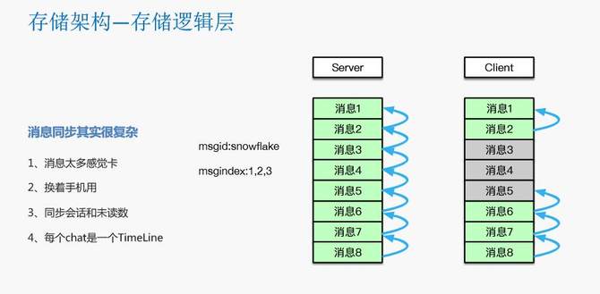 第一个就是刚才提到的减少存储量。这个是下面的存储库,比如有很多群,可能有2000多人有,如果我发一条消息就存2000份,那简直是灾难,所以说我们只能存一份,因此我们看这个图就是左边的蓝色之后,我们只存了一份,标明了这个消息ID,标明了这是哪个会话或者是哪个群的。