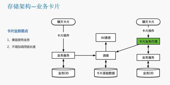 这个图右边有一个卡片的代理,右图有个绿色的卡片代理是我们对这个业务设置的一个特殊的东西,我们在推广的时候遇到很多问题,我们这些业务原有的业务部门,他们都做得有接口是现成的,由于你把它搬到了IM交互里面有几种方法:第一你们全部给我改一下,这个是很困难,有些业务说他不愿意,我们就设计了这么一个代理的产出的卡片的所有响应试点,先打到我们的一个代理模块,代理模块再去适配你原有的业务逻辑,这样子代理模块,知道用户操作行为到底是什么样,成没成功,成功了或者没成功,他再通过调度,通过他们的通道通知相关业务的各方结果,这是一种策略。