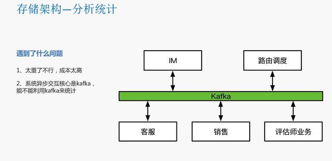 我们这个项目于对实时统计的要求很高,比如及时回复率这些各种各样的统计要求实时的监控报警,怎么做呢?这是我们整个系统另一个角度的一个架构,和我们一些跟消息相关的或跟一些业务调度相关的,我们都走了一个kafka,就是通道的以及送给客服的一些销售评估师等等,他们业务线的这些逻辑,我们通过kafka传递一些比较多的数据。我们在想能不能用借用kafka来简单的实现技术,事实上是可以,这概念是一个流式数据库,我们最初的结构就是图左边这一块,整个系统中间走的消息都通过了一个kafka.