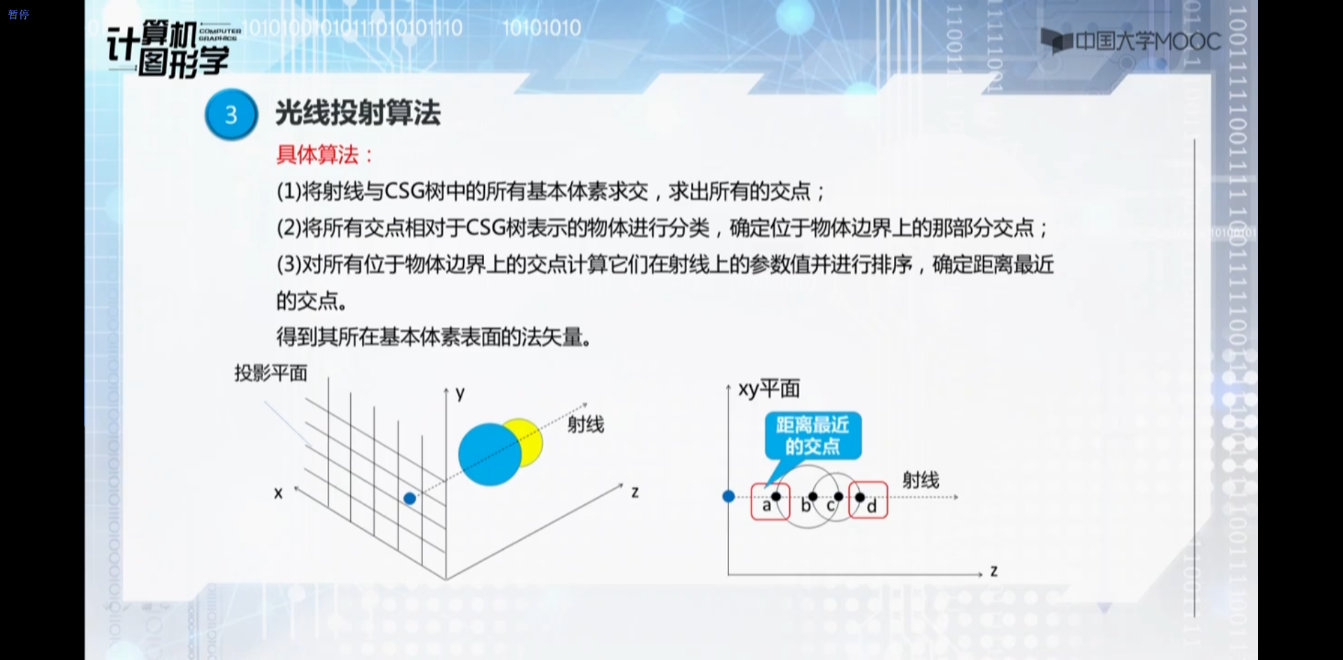 这个算法的关键之处在于确定光线与距离投影平面最近的可见表面的交点。这可以通过集合成员分类算法来实现的