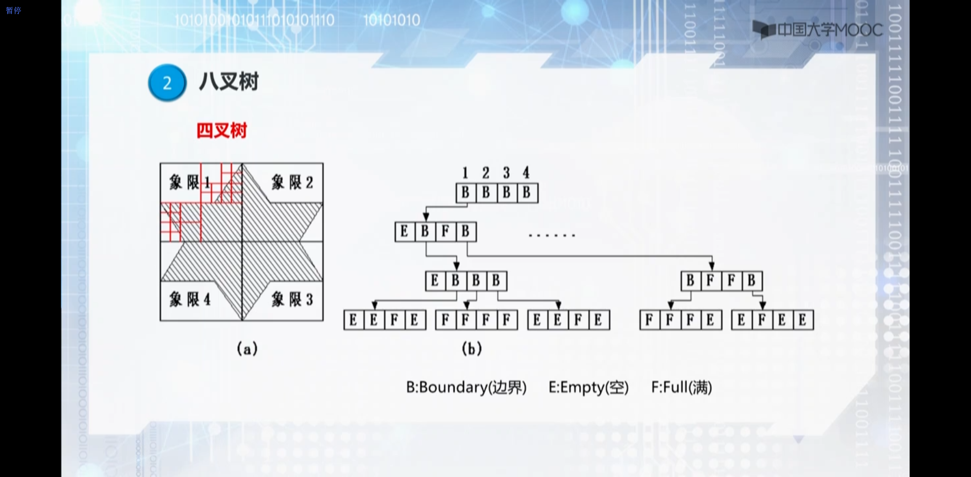 E是Empty的首字母,F是Full的首字母。否则,它就是属于边界部分,也就是Boundary部分,需要继续细分。那细分的方法怎样?还是分成四个部分,一直这样下去,直到每个部分在满足精度要求的情况下空或者是买。这样,就构成了一个四叉树。