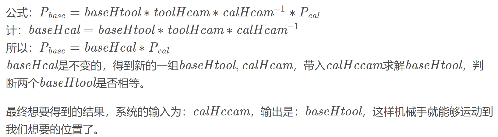 - toolHcam:表示相机坐标系到机械手坐标系的转换关系;这个转化关系在机械手移动过程中是不变的;(未知,待求)