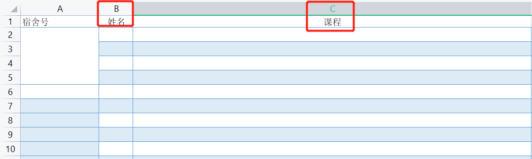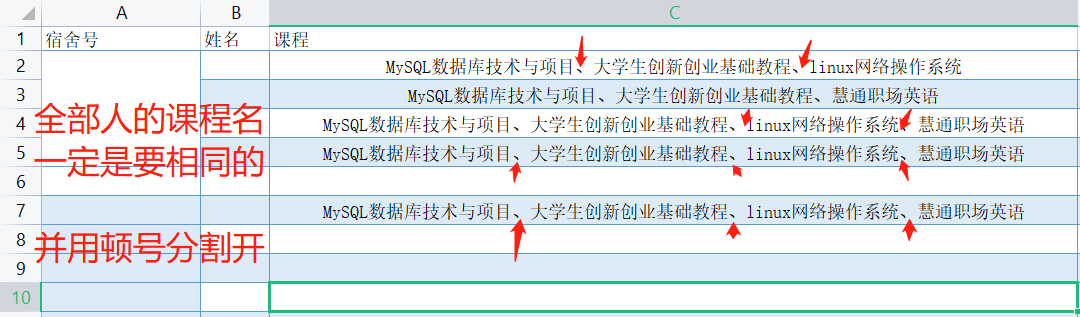 注意:这里一定要确保是以姓名之后是课程的顺序,关于B列姓名、C列课程,列可以不同。(如果不同一定要在代码中修改,否则程序读取不到数据!!!)