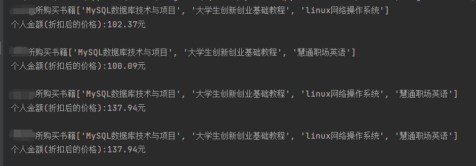讯享网def Sum(): # 计算个人金额 lst = { '*': ['MySQL数据库技术与项目', '大学生创新创业基础教程', 'linux网络操作系统'], '*': ['MySQL数据库技术与项目', '大学生创新创业基础教程', '慧通职场英语'] } """ lst作为少量数据计算的测试,若成功计算出结果,则使用ls计算全班的书本费 """ ls = { '*': ['MySQL数据库技术与项目', '大学生创新创业基础教程', 'linux网络操作系统'], '*': ['MySQL数据库技术与项目', '大学生创新创业基础教程', '慧通职场英语'], } """ 将每一本书对应的金额设置参数,设为float值,每个书本起始值为0元,用for循环遍历字典中的键对值, 因为这里的书本内容是以字典的方式存储,所以算起来更加的方便。 """ MySQL_book, MySQL_book_money, MySQL_book_sum = 'MySQL数据库技术与项目', float(34.20), float(0) Sinnovation_book, Student_innovation_money, Sinnovation_sum = '大学生创新创业基础教程', float(30.32), float(0) Java_book, Java_book_money, Java_book_sum = "java基础入门", float(45.45), float(0) Linux_book, Linux_book_money, Linux_book_sum = "linux网络操作系统", float(37.85), float(0) English_book, English_book_money, English_book_sum = "慧通职场英语", float(35.57), float(0) Politics_book, Politics_book_money, Politics_book_sum = "新编普通高等学校军事课教程", float(30.25), float(0) NoSQL_book, NoSQL_book_money, NoSQL_book_sum = "NoSQL数据库技术与应用", float(60.65), float(0) sum_book = float(0) # 这里的sum_book作为每一次判断运算 w = open("教材统计.txt", "w", encoding="UTF-8") """ 每一次遍历循环判断此人是否包含对应的书,然后计算个人书本费 """ for i in ls.items(): for j in range(2): if len(i) != 0: if MySQL_book in i[j]: MySQL_book_sum += (sum_book + MySQL_book_money) if Sinnovation_book in i[j]: Sinnovation_sum += (sum_book + Student_innovation_money) if Java_book in i[j]: Java_book_sum += (sum_book + Java_book_money) if Linux_book in i[j]: Linux_book_sum += (sum_book + Linux_book_money) if English_book in i[j]: English_book_sum += (sum_book + English_book_money) if Politics_book in i[j]: Politics_book_sum += (sum_book + Politics_book_money) if NoSQL_book in i[j]: NoSQL_book_sum += (sum_book + NoSQL_book_money) count = "{}所购买书籍{}\n个人金额(折扣后的价格):{:.2f}元\n".format( i[0], i[1], MySQL_book_sum + Sinnovation_sum + NoSQL_book_sum + Linux_book_sum + Java_book_sum + Politics_book_sum + English_book_sum ) print(count) MySQL_book_sum, \ Sinnovation_sum,\ NoSQL_book_sum,\ Linux_book_sum,\ Java_book_sum,\ Politics_book_sum,\ English_book_sum = float(0), float(0), float(0), float(0), float(0), float(0), float(0) w.writelines(count) # Sum()