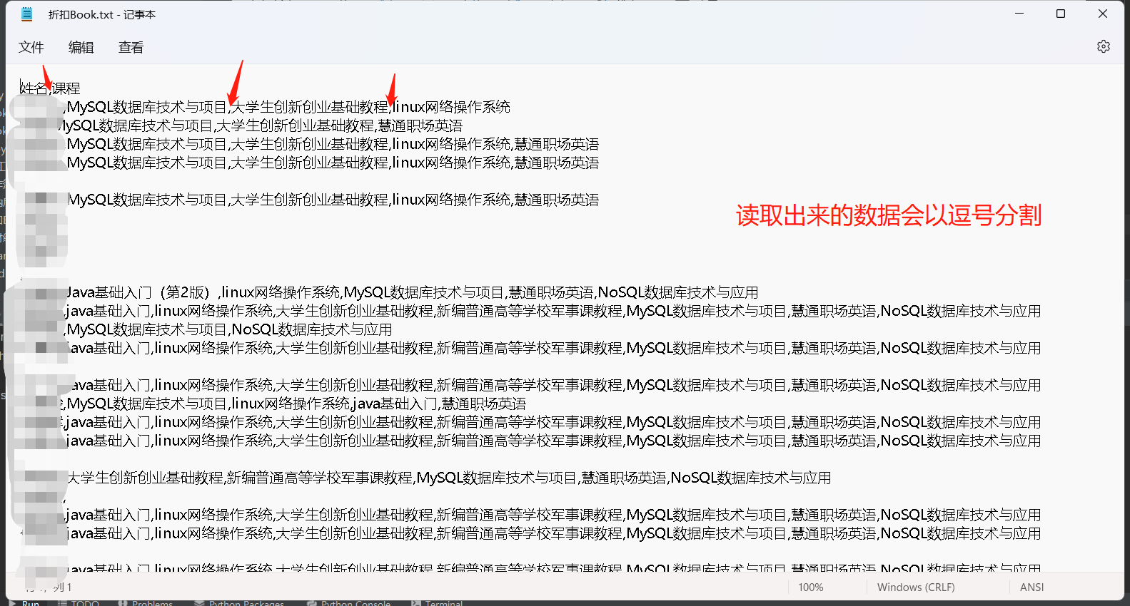 我可以看到每一个人程序都将它换行处理了,而我们需要的是读取每一个人的姓名以及对应的课程,放入字典中,星成键(姓名)对值(书本)。