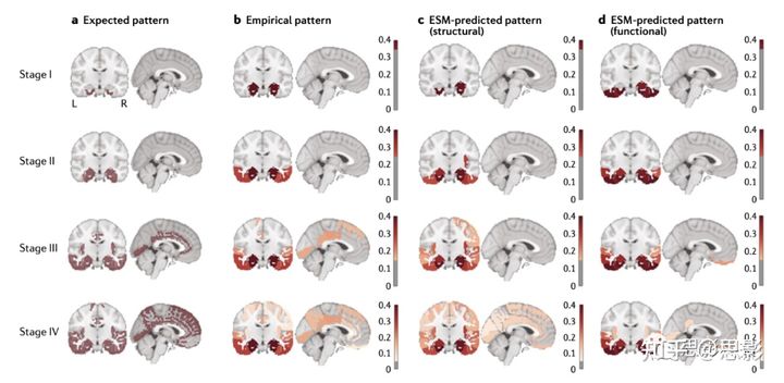 图5 |假设的、经验的和预测的tau传播模式网络扩散模型(Network diffusion models, NDNs;框5)也被用来研究AD的病理模式。这些模型表明AD病理弥漫性扩散,并预测了未来的皮质萎缩模式和糖代谢低下模式。