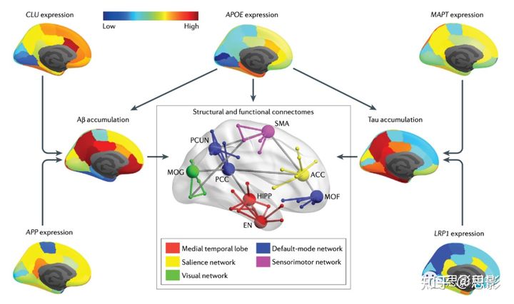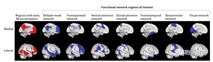 研究表明,与没有认知障碍的老年人相比,AD患者的脑网络特征是小世界特征的丧失(趋向于随机和/或规则的网络拓扑结构),模块结构异常,hub区域(特别是位于DMN和内侧颞叶的hub)改变。值得注意的是,楔前叶/PCC (DMN的一部分)和内嗅皮层(位于内侧颞叶)分别是Aβ和tau蛋白的初始沉积位点(图2)。在没有认知障碍的个体和患有AD痴呆的个体的人类连接体研究中有许多总结。在这里,我们特别讨论了在AD的不同亚型和阶段,Aβ病理学、tau病理学和遗传变异对功能和结构网络组织的影响。