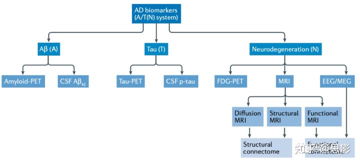 阿尔茨海默症(Alzheimer disease, AD)是一种普遍的、致残的神经退行性疾病,其特征是进行性神经元和突触丧失以及伴随的神经元连接下降。这些病理特征破坏了大脑的结构和功能网络,导致严重的认知和行为障碍。临床上,早期AD的典型特征是由内侧颞叶神经退行性变引起的记忆障碍。随着疾病的发展,神经退行性变逐渐扩散到颞叶和顶叶皮质,最终扩散到大部分皮质。AD相关的障碍也见于其他认知领域,如语言、视觉空间能力、注意力和执行功能。例如,患者可能会记不住人名或物体的名字,不能在开车时导航,或不能做出财务或其他重要决定。生物学上,AD由两个主要的神经病理特征定义:细胞内含有淀粉样β蛋白(Aβ)斑块的异常累积和细胞外含有tau蛋白的神经原纤维缠结。越来越多的证据表明,Aβ最初积聚在内侧额叶皮层和内侧顶叶皮层,这两个都是默认网络(default-mode network, DMN)的组成部分。相反,tau最初沉积在内侧颞叶记忆系统,从内嗅皮层扩散到海马和海马旁皮层,然后再扩散到大脑其他区域。Aβ和tau可通过脑脊液(cerebrospinal fluid, CSF)分析或PET在人体内检测。此外,基于血液的AD病理生理学分析已经开发出来;这些检测方法比CSF和PET方法侵入性更小,成本更低。神经退行性变或神经损伤的生物标志物可通过一系列技术检测,包括PET (葡萄糖代谢)、MRI (结构、功能和扩散)、EEG和脑磁图(magnetoencephalography, MEG)。值得注意的是,AD生物标志物的变化是在一系列阶段之后发生的,在AD症状出现的几十年前,Aβ和tau在没有认知障碍的个体中开始积累(临床前AD, preclinical AD)。前驱性AD (Prodromal AD)的定义是最初出现轻微的认知症状,通常伴有生物标志物的变化,包括指示神经变性的标志物。最后,AD痴呆的定义是存在认知障碍,并伴有日常生活中工具性活动能力的下降。A/T(N)框架是一个基于特定生物标志物(框1)的实用研究分析方案,为AD的脑网络机制研究提供了明确的生物学基础。