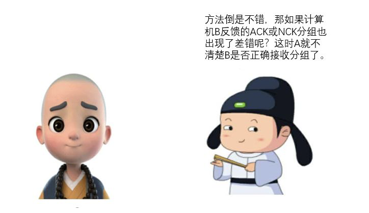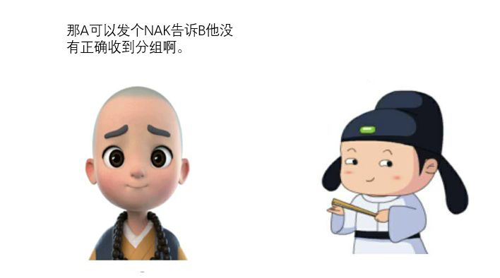 一禅:如果没有差错的话,计算机B就给计算机A发送一个ACK分组,告诉对方,数据正确无误。如果出现差错的话,就给对方发送一个NAK分组,告诉对方,分组数据出现了差错。