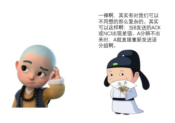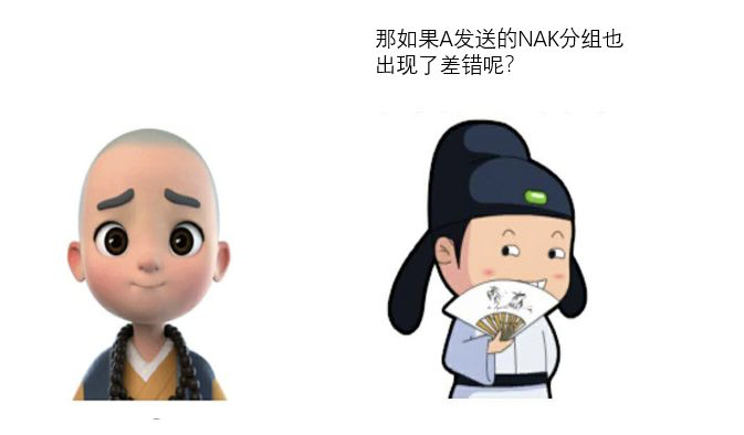 一禅:哈哈,我知道怎么解决,可以采取和分组差错类似的方法,如果A迟迟没有收到B的反馈,A就可以认为这个分组丢失了,重新发送。