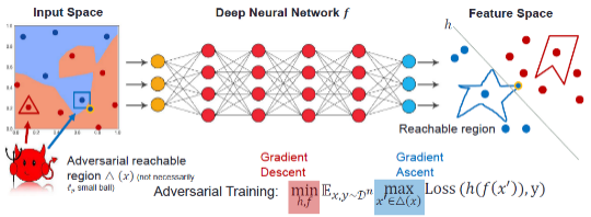 针对机器学习模型对对抗样本的鲁棒性较差的问题,研究者们提出了对抗训练的方法解决这个问题。图1a公式中出现的最大化和最小化问题一般分别使用梯度上升法和梯度下降法求解。最大化问题是为了寻找近邻区域中的最差点进而使得机器学习模型犯错,最小化问题是为了更新神经网络f以及线性分类器h的权重,使得神经网络能够正确识别最差点并且能够使得分类超平面尽可能地往最差点的远处进行推进。通过最小化和最大化过程的交替进行,算法最终会达到稳定的状态。