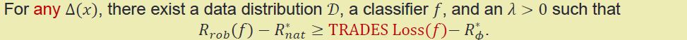 其中等式右边第一项通过最小化模型在干净数据上的预测和真实标签之间的差距来提升模型的准确性,等式右边第二项通过最小化模型在干净数据和对抗样本上预测之间的差距来提升模型的鲁棒性。对TRADES的理论分析给出如下定理。