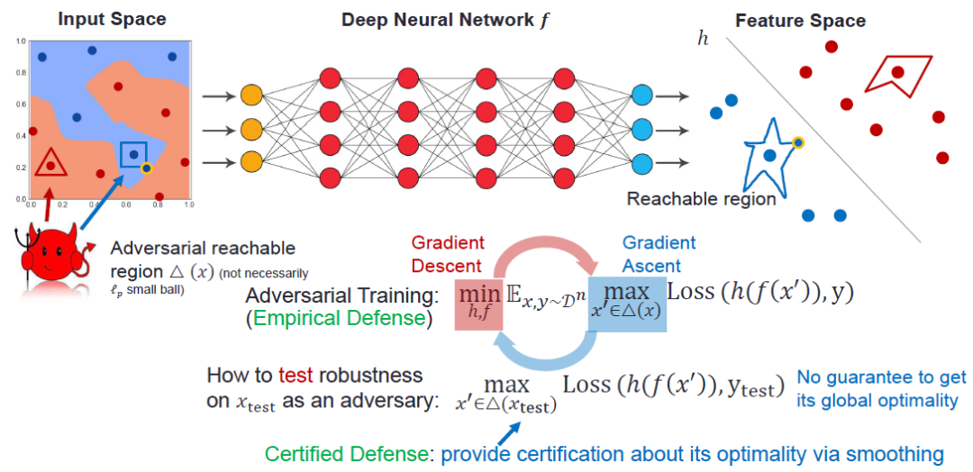 如图1b所示,测试阶段针对对抗训练方法得到的分类器,我们使用相同的最大化问题来测试其鲁棒性;不同的是,此时我们使用的是测试数据。但由于优化问题的非凸性,我们很难保证这一过程能够帮助我们找到最优的对抗样本。所以对抗训练往往也被称为经验防御模型,与此对应的是有证明保障的防御模型。