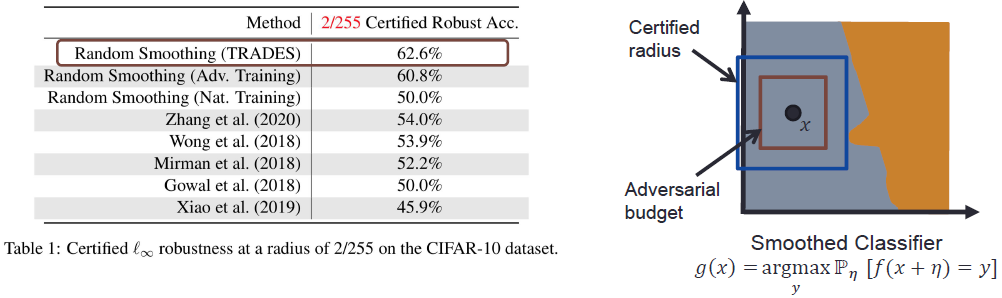使用该方法,我们可以得到平滑分类器g在数据集上的鲁棒准确率,如下表所示。如果将基分类器取为TRADES训练得到的分类器,运行Randomized Smoothing算法可以发现,当对抗攻击者对每个像素最多扰动2个像素值时,该方法得到的鲁棒准确率可达62.6%,达到当前最优水平。