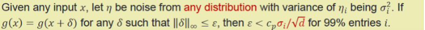 给定任意输入点x,η为任意分布采样得到的噪声,且其第i个分量的方差是σi2。假设平滑分类器g对任意不超过扰动半径ɛ的对抗扰动总是给出相同的预测标签。那么,对于99%的分量i而言,ɛ不会超过,其中为输入点的维数。