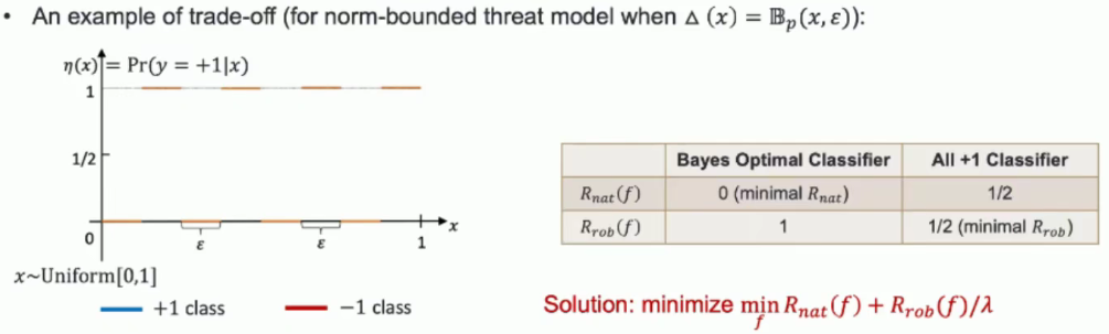 经验防御模型的设计受到模型的鲁棒性和准确性两者间此消彼长的关系启发。下图2给出了该关系存在性的证明。从表中可以发现,如果我们想通过Bayes分类器得到最优的Rnat,此时Rrob会高达100%;如果我们想通过全判正类的分类器得到最优的Rrob,此时Rnat会高达50%;从下表中我们就可以得到Rnat和Rrob之间此消彼长的关系。既然不能同时对二者进行最小化,那么我们就对他们的加权平均进行最小化,其中λ(正则化参数)用于平均Rnat和Rrob的重要性。