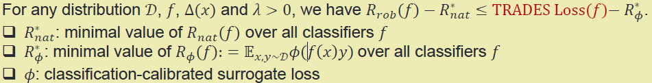 对于任意的数据分布D,任意的分类器f,任意的数据点近邻区域Δ(x)以及任意的正则化参数λ而言,我们总是能够用TRADES Loss和最优的Surrogate loss之间的差值来上界Rnat和Rrob之间的差值: