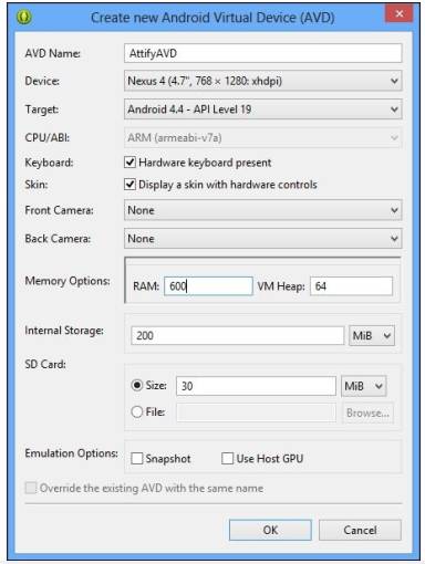 这会打开一个新窗口,其中包含需要为 Android 虚拟设备配置的所有属性( 尚未创建) 。 我们将配置所有选项,如下面的截图所示: