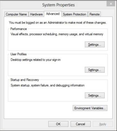 4. 一旦我们进入了 System Properties ( 系统属性) 对话框,在右下角,我们可以看到 Environment Variables... ( 环境变量) 选项。 当我们点击它,我们可以看到另一个窗口,包含系统变量及其值,在 System variables ( 系统变量) 部分下: