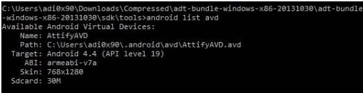 6. 一旦设备加载,我们现在可以访问我们的命令提示符,并使用 android 命令检查设备配置。 此二进制文件位于安装中的 /sdk/tools 文件夹下的 adt-bundle 文件夹中。
