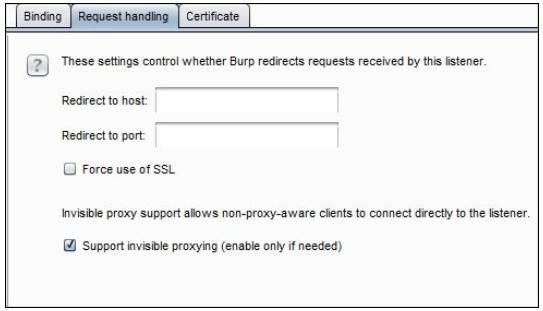 5. 接下来,我们需要访问 Request handling ( 请求处理) 选项卡,并选中 Support invisible proxying (enable only if needed) ( 支持不可见代理( 仅在需要时启用) ) 复选框: